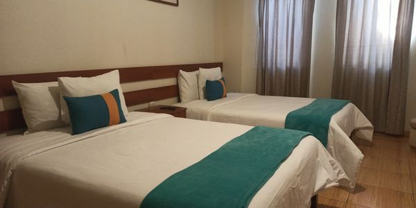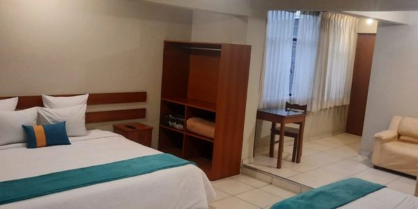 1 cama king size, 2 camas ambas de 2 plazas, una pequeña sala y frigobar, cuenta con baño privado y demás servicios que harán que su estadía sea placentera y relajante